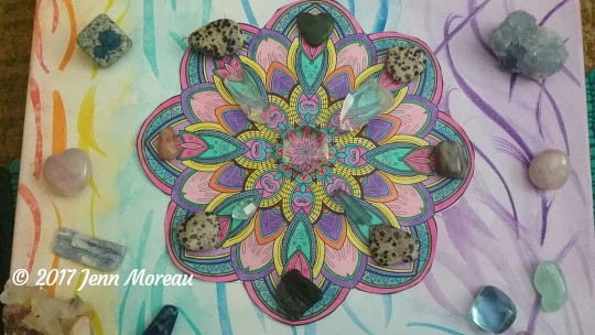 Deep breaths in and long exhales, using crystals and sound healing tools, creating art and writing.