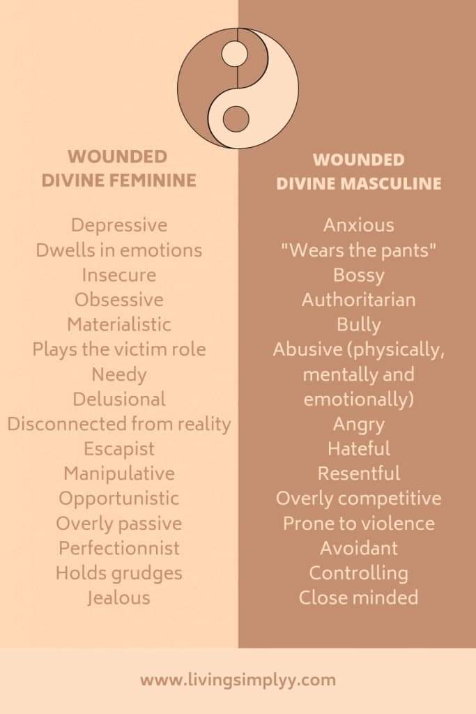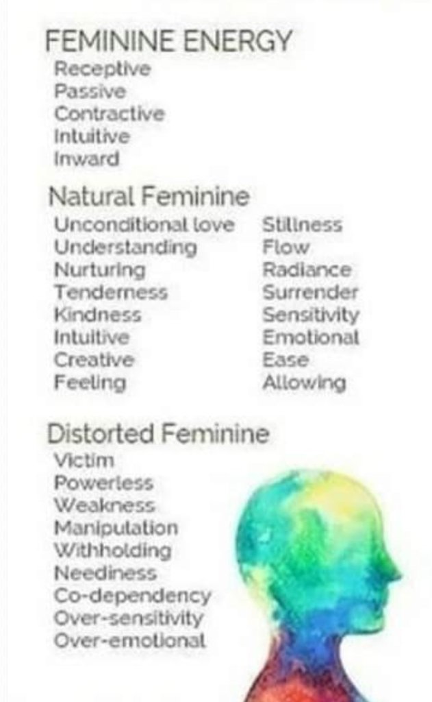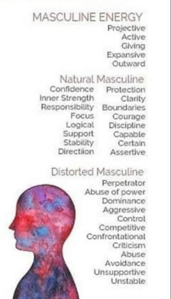 I found these 2 photos ( above and below) to be quite helpful as I discovered some of my own traits that were out of alignment. I found some distorted masculine traits within my own being and some feminine distortions as well. I am working with me on this journey. Exploration of these traits in my own life as well as articles about these topics have been a great help to me.