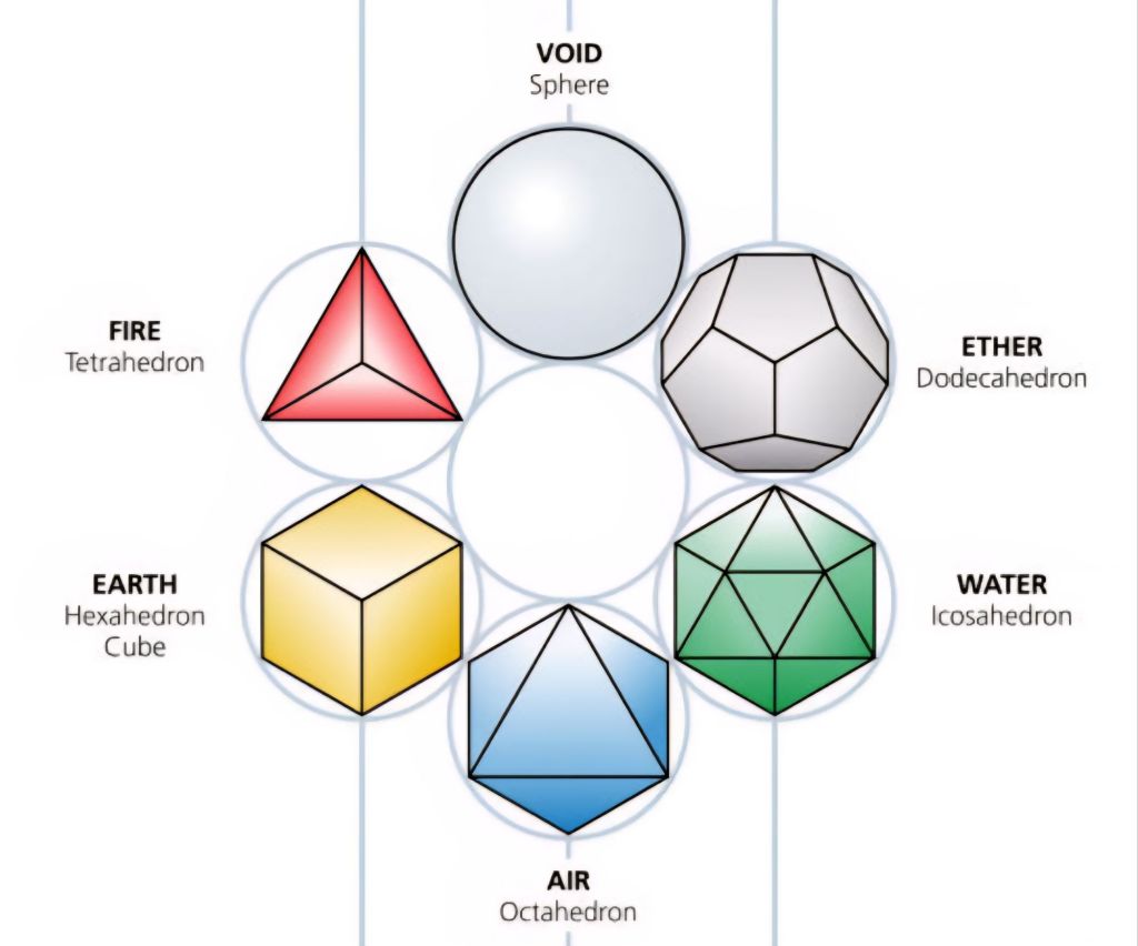 Dodecahedron – Considered to be aether or consciousness, connected to the throat, 3rd Eye and crown chakras. The all prevalent energy or animating force behind all creation, frequency, vibration, light, or information.